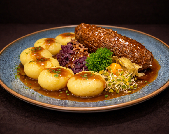 Classic beef roulade served with Silesian dumplings and braised red cabbage.