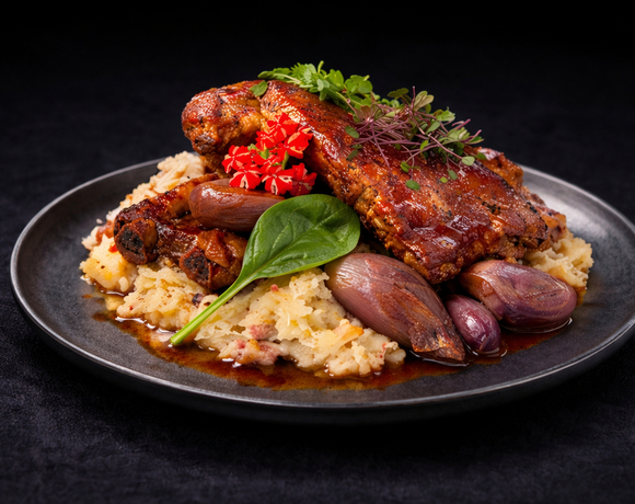 Tender ribs slow-cooked in a flavorful beer sauce, served with creamy mashed potatoes, tangy sauerkraut, and classic gravy – a true feast for gourmets.